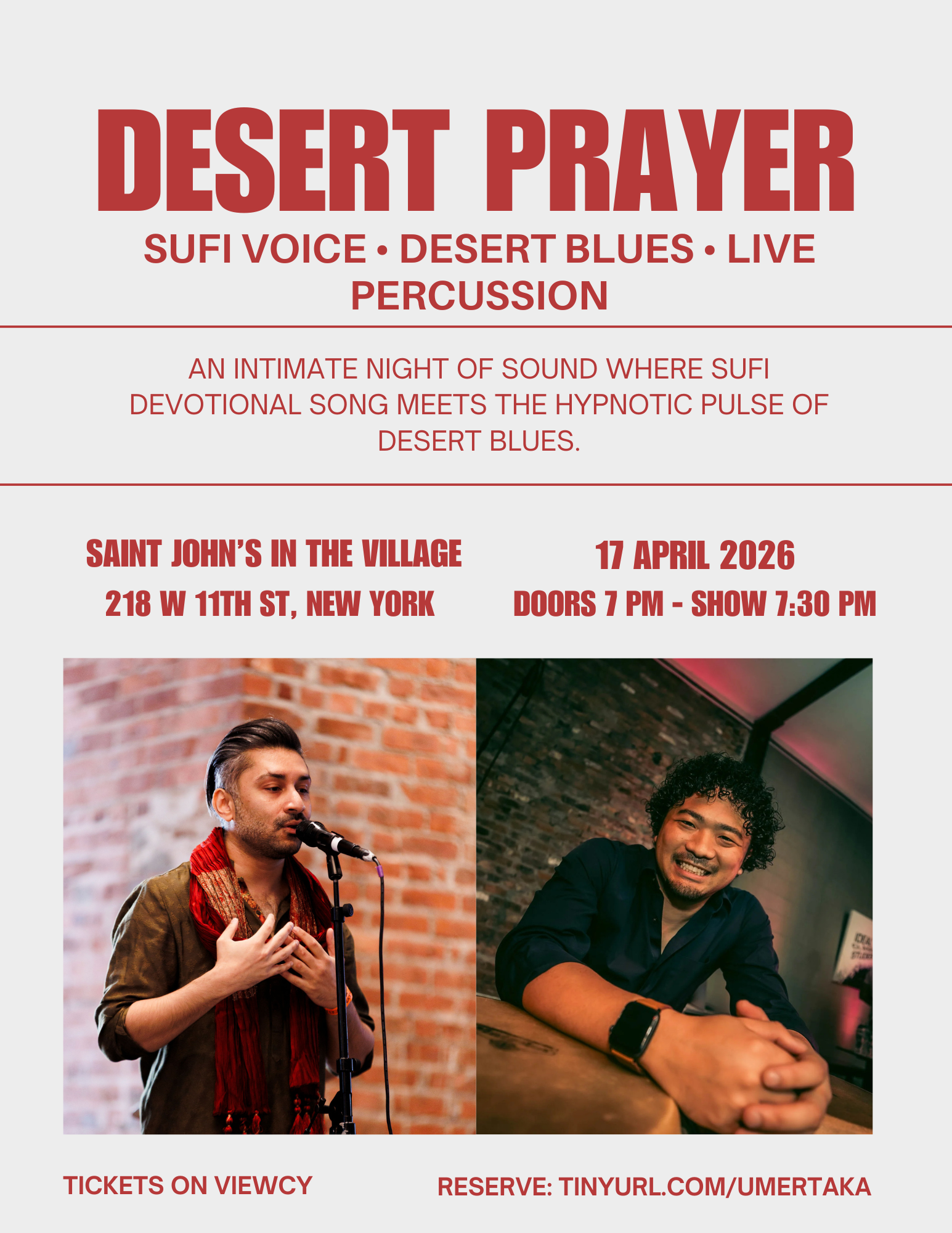 Vocalist Umer Piracha brings the depth of 700-year-old Sufi musical tradition into a living, unfolding moment, joined by desert blues guitar and the dynamic percussion of Takafumi Nakaido.